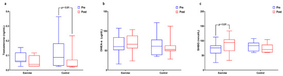 Effect of 12 weeks of aquatic exercise on aging-related sex hormones in elderly Korean women; (a) Testosterone of the control group was significantly decreased. (p < 0.01); (b) DHEA-S showed significant interaction effects (p < 0.05); (c) SHBG was significantly increased in the exercise group (p < 0.01). SHBG: sex hormone-binding globulin.