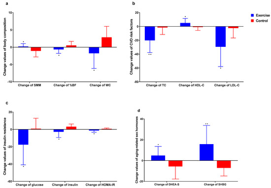 Difference in the change value of each of the variables. (a) Body composition; (b) Cardiovascular disease risk factors; (c) Insulin resistance. (d): Aging-related sex hormones. * p < 0.05, ** p < 0.01.