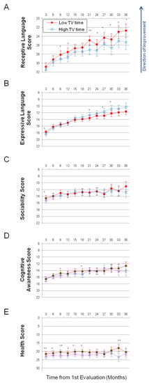 On the receptive language subscale, the average improvement in high TV users over 36 months was 6.09 points (SE = 0.80, p < 0.0001) compared to 8.08 points (SE = 0.68, p < 0.0001) in low TV users, Figure 1A, Table 3, Table S1. The difference in high TV users relative to low TV users at month 36 was statistically significant: 2.58 points (SE = 1.04, p = 0.0128). The positive difference (marked in the Table 3 as “High–Low”) indicates that high TV users had greater scores at month 36 and, therefore, more severe symptoms. On an annualized basis, low TV users improved their receptive language 1.4 times faster than high TV users (high TV users = 2.0 points/year; low TV users = 2.7 points/year).