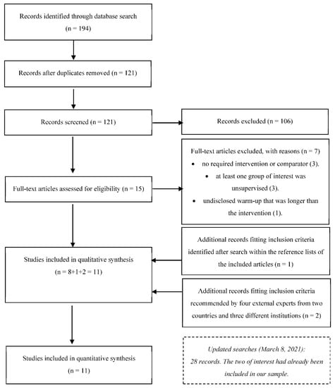 An initial search returned 194 results (52 in Cochrane Library, 11 in EBSCO, 11 in PubMed, 9 in Scielo, 88 in Scopus, and 23 in Web of Science). After removal of duplicates, 121 records remained. Screening the titles and abstracts for eligibility criteria resulted in the exclusion of 106 articles: 26 were not original research articles (e.g., trial registrations, reviews), 24 were out of scope, 48 did not have the required intervention or comparators, five did not assess ROM, two were non-randomized and one was unsupervised. Fifteen articles were eligible for full-text analysis. One article did not have the required intervention [64], and two did not have the needed comparators [65,66]. In one article, the ST and stretching groups performed a 20–30 min warm-up following an unspecified protocol [67]. In another, the intervention and comparator were unsupervised [68], and in one the stretching group was unsupervised [69]. Finally, in one article, 75% of the training sessions were unsupervised [70]. Therefore, eight articles were included at this stage [33,43,44,45,46,71,72,73].