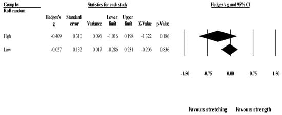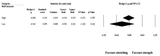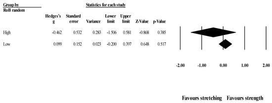 Effects of ST versus stretching on ROM, moderated by study RoB in randomization: No significant sub-group differences in ROM changes (p = 0.256) was found when programs with high RoB (6 studies; ES = −0.41; 95% CI = −1.02 to 0.20; within-group I2 = 77.5%) were compared to programs with low RoB (4 studies; ES = −0.03; 95% CI = −0.29 to 0.23; within-group I2 = 0.0%) (Figure 3).