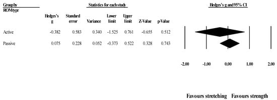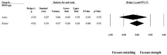 Effects of ST versus stretching on ROM, moderated by ROM type (active vs. passive): No significant sub-group difference in ROM changes (p = 0.642) was found after training programs that assessed active (8 groups; ES = −0.15; 95% CI = −0.65 to 0.36; within-group I2 = 78.7%) compared to passive ROM (6 groups; ES = −0.01; 95% CI = −0.27 to 0.24; within-group I2 = 15.3%) (Figure 5).
