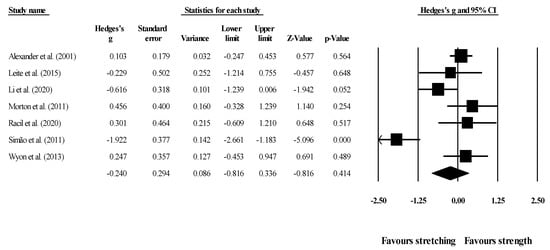 Effects of ST versus stretching on hip flexion ROM: Seven studies provided data for hip flexion ROM (pooled n = 294). There was no significant difference between ST and stretching interventions (ES = −0.24; 95% CI = −0.82 to 0.34; p = 0.414; I2 = 80.5%; Egger’s test p = 0.626; Figure 6). The relative weight of each study in the analysis ranged from 12.0% to 17.4% (the size of the plotted squares in Figure 6 reflects the statistical weight of each study).