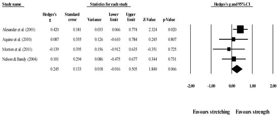 One article showed significant reductions in pain associated with increases in strength [46]. Therefore, decreased pain sensitivity may be another mechanism by which ST promotes ROM gains. An improved agonist-antagonist coactivation is another possible mechanism promoting ROM gains, through better adjusted force ratios [40,73]. Also, some articles included in the meta-analysis assessed other outcomes in addition to ROM, and these indicated that ST programs may have additional advantages when compared to stretching, such as greater improvements in neck flexors endurance [46], ten repetition maximum Bench Press and Leg Press [45,78], and countermovement jump and 60-m sprint with hurdles [33] which may favor the choice of ST over stretching interventions.