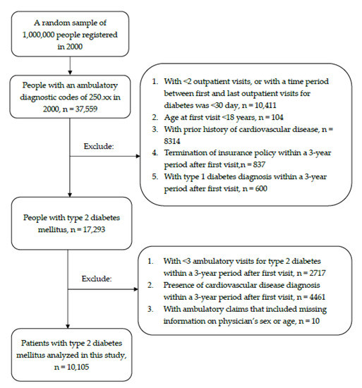 We set a three-year period after cohort entry as the baseline period to determine the primary physician for each T2DM patient. In doing so, we further excluded: (1) those who had <3 ambulatory visits for T2DM within baseline period (n = 2717); (2) those who developed cardiovascular disease within baseline period (n = 4461); and (3) Patients with missing information of physician’s gender and age in their medical claims (n = 10). The study subjects finally consisted of 10,105 patients with T2DM (4962 men and 5143 women) who can be either incident or prevalent cases at cohort entry. Figure 1 shows the flow chart of study subjects’ enrolment.