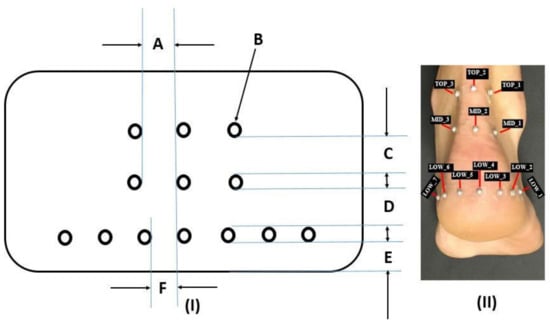 (I): Custom designed template used to position the retroreflective markers on the heel. The internal dimensions were as follows: A represents the horizontal spacing distance for the TOP and MID retroreflective marker provisions (2 in number), B represents the 2 mm diameter perforated holes (13 in number), C represents the 2 cm vertical spacing distance between the TOP and MID retroreflective marker provisions, D represents the 2 cm vertical spacing distance between the MID and LOW retroreflective marker provisions, E represents the horizontal spacing distance for the LOW (bottom) markers (6 in number). (II): Pictorial illustration showing the retroreflective marker positions on the heel (Note: the size of the retroreflective markers are 3 mm in diameter).