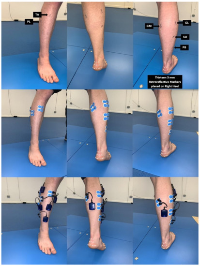 Electrodes were placed over the belly of the muscles under investigation. To reduce the impedance interface between the skin and the electrodes, the tested areas were shaved and cleaned using abrasive pads for skin preparation (AMBU ® 2121M Skin Prep Pad, Ambu Ltd., Cambridgeshire, UK) and alcohol wipes (Medi-Swab Seton Health Care Group Plc, Banbury, UK). According to SENIAM guidelines [24] for the lower leg, electrodes with an inter-electrode separation of 2 cm were placed on the longitudinal axis of the muscle belly of the six muscles on the dominant leg: gastrocnemius medialis (GM), gastrocnemius lateralis (GL), soleus (SO), tibialis anterior (TA), peroneus longus (PL), and peroneus brevis (PB) (Figure 2).