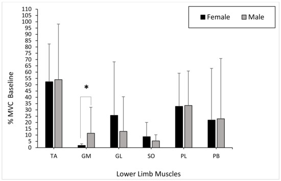 Mean gender differences in muscle activation (gastrocnemius medialis (GM), gastrocnemius lateralis (GL), soleus (SO), tibialis anterior (TA), peroneus longus (PL), and peroneus brevis (PB)) within the dominant limb during the baseline phase with error bars (± standard deviation; * statistical significance).