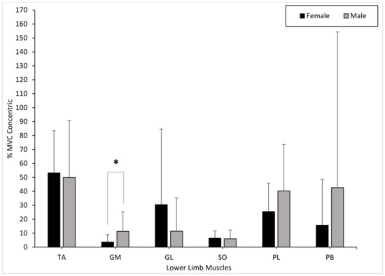 Mean gender differences in muscle activation (TA, GM, GL, SO, PL, and PB) within the dominant limb during the concentric phase with error bars (± standard deviation; * statistical significance).