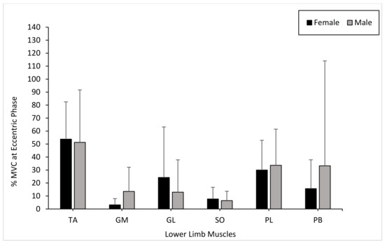 Mean gender differences in muscle activation (TA, GM, GL, SO, PL, and PB) within the dominant limb during the eccentric phase with error bars (± standard deviation).