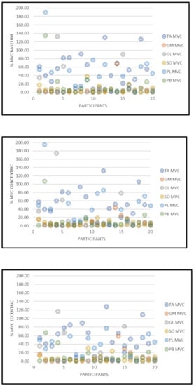 Inter and intra diurnal variation effects [35,36] were minimized for the 20 participants, as time of data collection was standardized for all subjects. Muscle activity in the PL from one participant for all phases of the heel raise was outlying, therefore this was removed from the analysis to prevent the data set from being affected. Unusual and abnormally high %MVCs that did not correspond to the %MVC pattern across the 20 participants were considered outliers. Although one outlier was removed from the data analysis three females and two male outliers at the baseline phase and two males and two females as outliers for the concentric and eccentric phases respectively were present in the data set. This variability is highlighted in Figure 5 and presented as a representative scatter plot showing the %MVC data set for all participants. A potential limiting factor for this present study was that surface EMG was used to analyze all six muscles in the lower limb. Incorporating fine wire/needle EMG into this current study may have resulted in a more precise insertion of the electrodes on smaller muscle bellies such as the TA, PL, and PB. Additionally, only the dominant limb was analyzed within this study. It cannot be ruled out that leg dominance along with foot posture may have influenced muscle activation during the heel raise protocol. Moreover, whilst the bar charts reported in the figures are reflective of the presented results, it is evident that the standard deviations were high. This outcome may have occurred for a variety of reasons. The participants may have exhibited some natural differences due to muscle physiology (e.g., number of motor units present in a specific muscle region detected by the EMG electrode capture volume). Other likely sources for variability in EMG recordings between participants, mostly relate to methodological issues such as problems in the normalization process, signal processing, skin impedance, crosstalk, etc. Although precautionary measures were observed during the participant preparation, experimental setup and data collection sessions, it is noteworthy that an appropriate normalization usually reduces inter-subject variability [37]. Further, during experimental planning the authors did not incorporate consideration for measurements acquired in accordance with the menstrual cycle of the female participants. It has been demonstrated that lower limb muscles in females are differentially recruited across the menstrual cycle [38,39,40]. This may be another limitation of this study. A further important consideration is the fact that, although no significant differences were observed for the BMI outputs (p > 0.05), statistical differences were exhibited between genders with respect to body mass (p < 0.001). Furthermore, despite the low to moderate physical activity levels demonstrated by the participants, it is probable that the results may have been influenced by the differences in the physical activity levels of the participants.