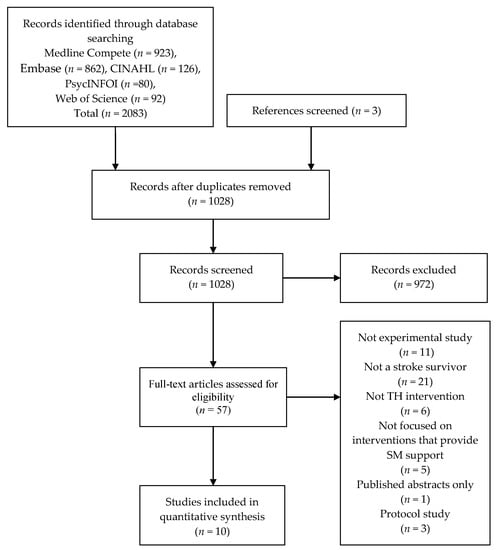 Of the 1028 titles and abstracts, ten studies were included in this review of TH-SM interventions for stroke survivors [,,,,,,,,]. Figure 1 shows a PRISMA flow chart shown in Figure 1 illustrates the search results and review selection. Two reviewers screened the full texts independently. The data were completed by one reviewer using a data extraction table, subsequently checked by a second reviewer for accuracy, with discrepancies resolved by discussion.