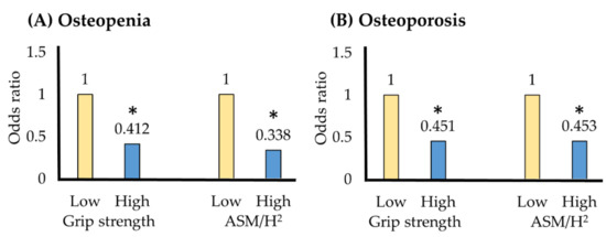 (A) Osteopenia and (B) osteoporosis odds ratios according to cutoff values. * p < 0.05; OR = odds ratio; CI = confidence interval; ASM/H2 = appendicular skeletal muscle mass/height2. Model 1 = adjustment variables age, body weight. Model 2 = adjustment variables age, body weight, alcohol frequency, strength exercise.