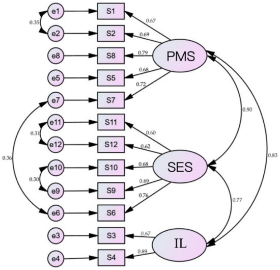 Community-dwelling older adults’ self-healing model. Confirmatory factor analysis based on 12 items and three factors. Note. PMS = physical and mental state; SES = socioeconomic and environmental state; IL = independent lifestyle.