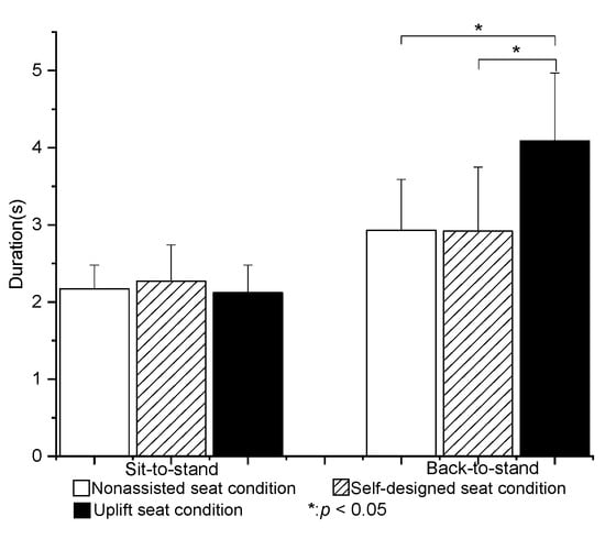 In the present study, the BTS duration increased significantly when using the UpLift seat. After completing the STS motion, the seat was in a fully expanded condition. Thus, to perform BTS motion, the subjects had to overcome the resistive force produced by the hydraulic mechanism of the UpLift seat. Accordingly, during BTS transfer, the subjects were required to shift their weight to a more rearward position of the seat cushion in order to apply their full body weight to the seat and drive it in a downward direction. The adjustment in the sit-down posture thus increased the BTS time compared to that in the nonassisted and self-designed lifting-seat conditions.