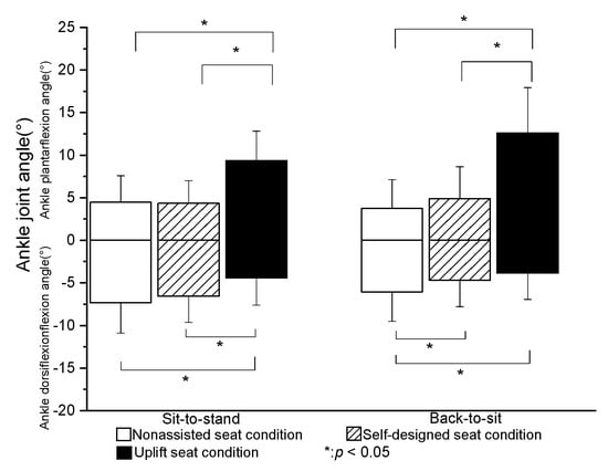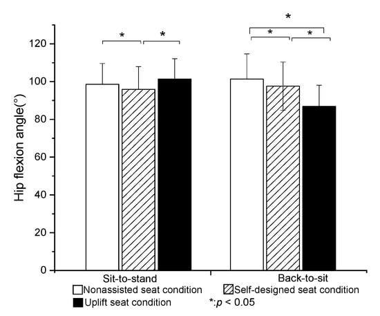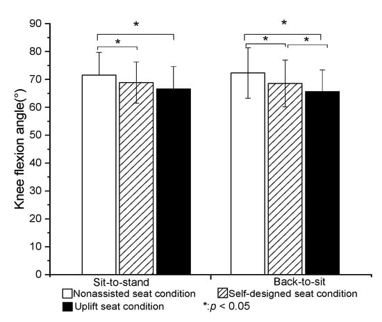 The present results showed that the self-designed lifting seat significantly reduced the flexion angles of the hip and knee (by 3% and 2%, respectively) during STS transfer compared to the nonassisted seat. Compared to the self-designed lifting seat and nonassisted seat, the UpLift seat significantly reduced the knee flexion angle during STS motion, but significantly increased the hip flexion joint angle. The UpLift seat also significantly increased the ankle plantar flexion angle compared with the nonassisted seat and self-designed lifting seat. These findings differed from those of Rutherford et al. [