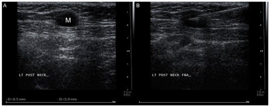 - Cho, W.; Kim, M.K.; Sim, J.S. Ultrasound-guided core needle biopsy of cervical lymph nodes in the diagnosis of toxoplasmosis. J. Clin. Ultrasound 2017, 45, 192–196. [Google Scholar] [CrossRef] [PubMed]