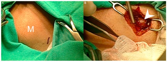 (A) A well-defined and soft mass was noted in the left posterior neck. No erythematous change or local heat over the skin was observed. (M: mass). (B) The incision was made above the mass. The left neck mass (arrowhead) was explored and en bloc resection was conducted.