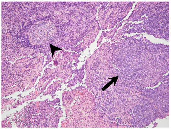 Microscopic examination revealed reactive follicular hyperplasia (arrowhead) and the presence of small clusters of epithelioid histiocytes (arrow) in the affected lymph node (original magnification ×40).