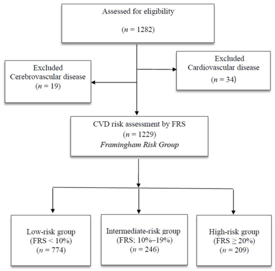 A total of 1282 people aged 30–74 years [13] who underwent a health examination at a health examination center in Korea from June 1 to July 31, 2020 were enrolled in this study. Data were collected via physical examination, blood tests, and a self-report questionnaire. A total of 34 individuals diagnosed with a heart disease (e.g., angina, myocardial infarction) or currently taking medications and 19 people diagnosed with and currently taking medications for cerebrovascular disease (stroke, cerebral hemorrhage) were excluded from the study [13]. As a result, a total of 1229 participants were included in the analysis (Figure 1).