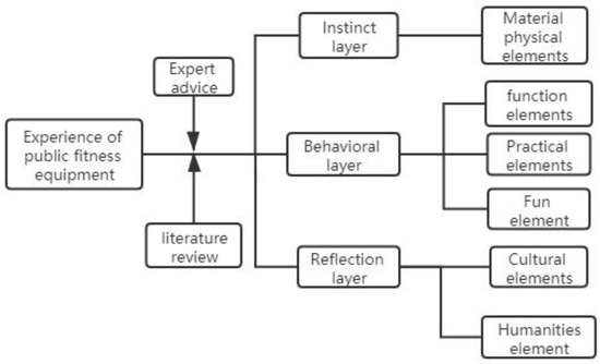 Subjective feeling established by the user in the experience of using the product is the user experience of the product, that is, all the feelings before, during, and after use. Norman proposed the three-level principle of experience in “Emotional Design”, namely the instinct level, behavior level, and reflection level. The instinct layer refers to the user’s subjective impressions and feelings about the appearance elements of actual things; the behavior layer refers to the product use process; the user gets the satisfaction and pleasure brought by the product performance, usability, functional practicability, etc.; and the reflection layer focuses on the consciousness and emotional feelings during the process of use, focusing on the experience reflection of humanistic thought and meaning brought by the experience process [12]. Based on the above literature, as shown in Figure 1, preliminary evaluation factors are selected from the physical factors of the product, the user’s behavioral factors, the environmental factors used, and the cultural factors. According to the instinct layer of public fitness equipment experience design, comparative analysis can include the product material characteristics, color, and other intuitive physical factors; the behavior layer includes the safety performance, practicality, interest, and other factors of the product during use; and the reflection layer represents the user’s more advanced ideological experience transforms the entire process of using the product into a special experience, summarizing the cultural nature of the product and the surrounding environment, and the humanistic factors attached to fitness activities.