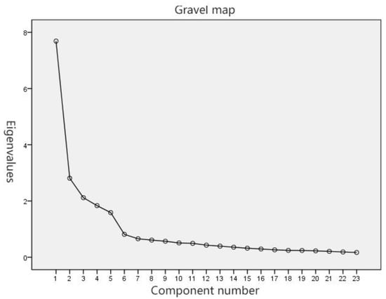 SPSS22.0 software was used to extract the principal component factors and perform exploratory factor analysis on 23 indicators based on the principal factor extraction diagram in Figure 2. It is found that the inflection point is the most obvious at the fifth factor. The first five factors are extracted alond with their contribution to the total variance. The rate reaches 69.72%, which can be better used as a common factor to represent the 23 indicators selected; that is, the 23 indicators of the questionnaire are summarized and classified into five main levels.