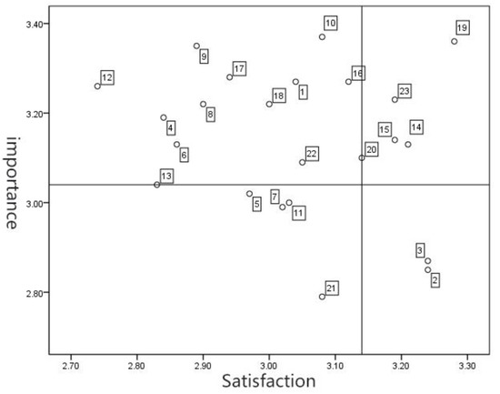 Figure 3 shows the satisfaction and importance values represented by each factor in this satisfaction evaluation. The results of the four-quadrant analysis are as follows: