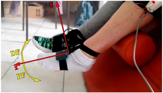 Movements of the foot in the sagittal plane were estimated based on the gravitational component of the acceleration and calculated as the arctangent of the ratio of the acceleration values in transverse and sagittal planes, according to the method described in [41].