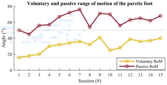 The participant completed 15 therapy sessions. The voluntary and passive range of motion in the sagittal plane of the paretic foot was recorded at the beginning of each session throughout the therapy, and the results are presented in Figure 2. The voluntary RoM increased from 16° at the baseline to 40° at the end of the therapy, while the passive increased from 50° to 68°.