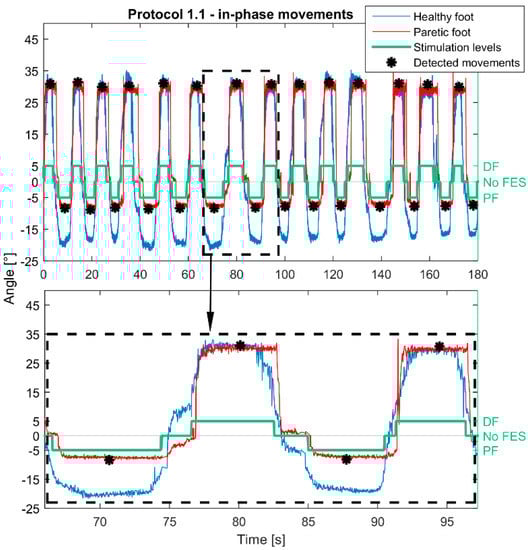 Example of Smart protocol 1.1. Movements were in-phase in the sagittal plane and the paretic foot was controlled by the healthy. Passing by the set thresholds (10°/−10° relive to the coordinate origin established at the beginning of the protocol) of the healthy foot activated configurations for dorsiflexion (DF)/plantar flexion (PF) of the paretic foot. When the healthy foot was between set thresholds, the stimulation was off. Calculated movements of the healthy foot are represented with red, and movements of the healthy foot with the blue line. Stimulation activations are shown with the green line. Estimated positions of the achieved FES-induced movements are marked with black asterisks.
