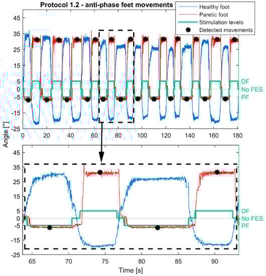 Example of the Smart protocol 1.2. Movements were in anti-phase in the sagittal plane and the paretic foot was controlled by the healthy. Passing by the set thresholds (10°/−10° relive to the coordinate origin established at the beginning of the protocol) of the healthy foot activated configurations for plantar flexion (PF)/dorsiflexion (DF) of the paretic foot. When the healthy foot was between set thresholds, the stimulation was off. Calculated movements of the healthy foot are represented with red, and movements of the healthy foot with the blue line. Stimulation activations are shown with the green line. Estimated positions of the achieved FES-induced movements are marked with black asterisks.