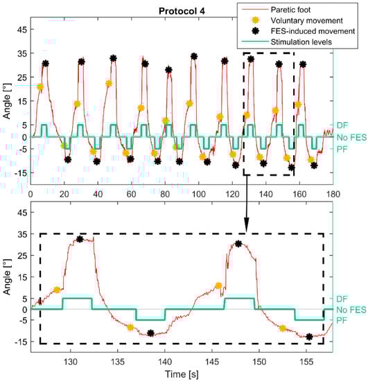In smart protocol 4, movements were induced by the paretic foot. The stimulation pattern was activated when there was not increase/decrease in movement amplitude for 0.5 s. The angle 0.5 s before FES activation represents voluntary movement and median value from the activation to the end of stimulation FES-induced movement. Figure 5 shows an example of the paretic foot trajectory, detected representative voluntary, and FES-induced movement angles during smart protocol 4.