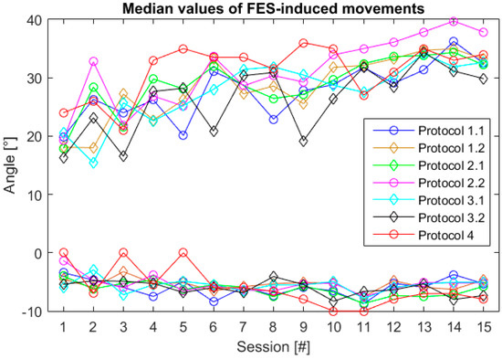 The session’s median values of representative angles for all Smart protocols throughout the therapy are shown in Figure 6. Positive values correspond to FES-induced DF and negative to FES-induced PF movements.