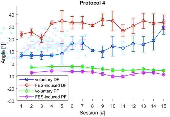 The calculated session’s median values of representative voluntary and FES-induced dorsiflexion (positive values) and plantar flexion (negative values) during Smart protocol 4 throughout 15 therapy sessions.