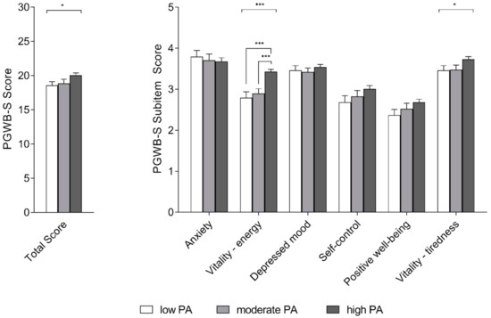 Psychological well-being in participants across the levels of PA (low, moderate, high). Left: PGWB-S total score; Right: PGWB-S subitems. Data are presented as mean score with standard error. Asterisks denote statistical significance (* = p < 0.05; ** = p < 0.01; *** = p < 0.001).