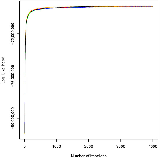 Convergence of the log-likelihood for five sets of 4000 integrations.
