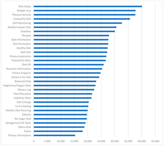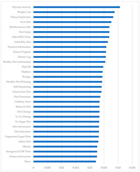 From the 41 topics provided by LDA, we found 32 meaningful and relevant topics. These topics covered a range of matters, such as self-monitoring and different types of diets (Table 1). We offered a definition for each of the topics, based on reviewing the top words per topic in Table A1, top tweets per topic using P(T|D), and related content on the web. Figure 3 shows the average weight of each topic per tweet from the highest frequency topic (i.e., physical activity) to the lowest frequency topic (i.e., detox). Figure 4 shows the number of tweets predominantly in each topic. For example, the highest and the lowest number of tweets were related to diet sodas and fitness information, respectively. We used the Kendall and Spearman tests to compare the ranking of topics in Figure 3 and Figure 4. Both tests showed a significant (p-value = 0.000 < 0.05) positive moderate to strong correlation (tau = 0.6 and rho = 0.77) between the ranking of Figure 3 and the ranking of Figure 4 [52].