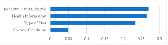 As depicted in Figure 5, the ranking of the average weight of categories per tweet from the highest to the lowest is (1) behavior and lifestyle, (2) health information, (3) type of diet, and (4) chronic condition. While health information contains more topics than other categories, the average weight of behavior and lifestyle category are more than other categories, indicating that the first category covers popular topics in our corpus.