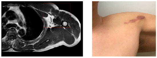 - Chang, E.S.; Zou, J.; Costello, J.M.; Lin, A. Accuracy of magnetic resonance imaging in predicting the intraoperative tear characteristics of pectoralis major ruptures. J. Shoulder Elb. Surg. 2016, 25, 463–468. [Google Scholar] [CrossRef] [PubMed]