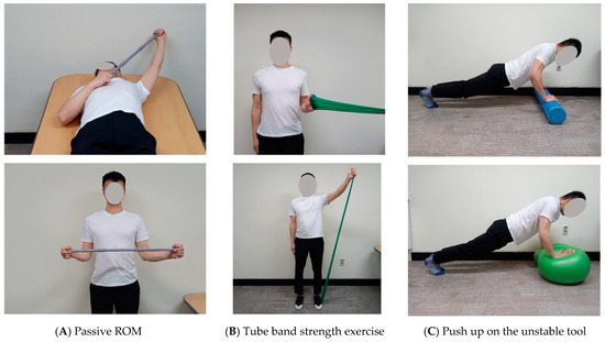 From Weeks 4–5, forward flexion was gradually increased using a pulley or T-bar, and mild abduction and external rotation were initiated. Isometric contractions were added in the pain-free range. Multi-direction pendulum exercises were allowed. After Week 6, active-assist ROM exercises were introduced, with the goal of gradually reaching full ROM. Subsequently, low-intensity isotonic strength exercises using tubing bands (Theraband Co., Akron, OH, USA) were also introduced. The patient was instructed to progress by one color a month over six months, from yellow through red, green, blue, black, and grey. Changes in the color of the tubing band and progression of the rehabilitation phase took place after a sports medicine doctor checked the patient’s 0 to 10 visual analog scale (to confirm that it was under 4), symptoms, and repair site safety.