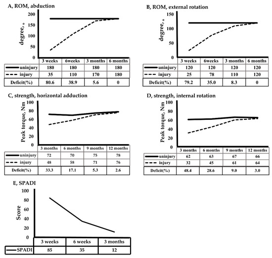 ROM: Abduction has a reference value of 180°. The injured side recovered to 35° at 3 weeks and 170° at 3 months. External rotation was 25° at 3 weeks, 78° at 6 weeks, and 110° at 3 months. ROM improved linearly from 3 weeks to 3 months. Three months were required for recovery to an angle within 10%, and full ROM was obtained in 6 months (Figure 4).