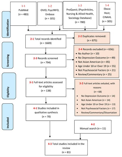 Studies were included if they satisfied the following criteria: (a) included Asian adolescents who were 10 to 19 years of age; (b) identified a dimension of depression, such as depressive symptoms or depressed mood, as one of the outcome variables; (c) focused on the North American context; (d) examined the influence of psychosocial factors on depressive symptoms; and (e) were published in an English, peer-reviewed journal. Depressive symptoms can be assessed by different instruments, such as the Centre for Epidemiologic Studies Depression Scale [29], the 13-item Short Mood and Feelings Questionnaire [30], the Depression Self-Rating Scale for Children [31], the Beck Depression Inventory—Second Edition [32], and the Children’s Depressive Inventory [33,34,35,36]. Studies were excluded if they met the following conditions: (a) did not have an author; (b) did not have predicted depression status or depressive symptoms as an outcome; (c) did not include Asian American groups in the sample of a study; (d) addressed adolescents under the age of 10 or over the age of 19; (e) focused on interventions or measurement validity and did not address psychosocial factors; (f) were a review, commentary, or dissertation; (g) were on an unrelated topic; (h) had no full text available.
