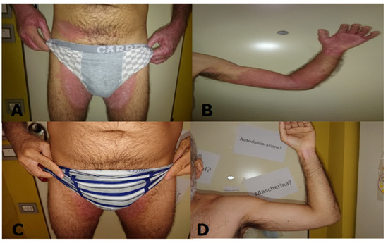 (A) Patient at baseline genital area; (B) patient at baseline left arm; (C) patient after one year, genital area; (D) patient after one year, left arm.