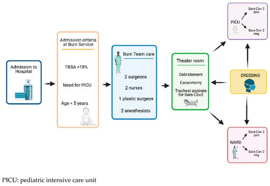 Children were admitted together with a caregiver and both were swabbed for SARS COV-2. After admission, each patient underwent general anesthesia before debridement and escharotomy procedures and tracheal aspirate for SARS COV-2, in accordance with the anti-COVID-19 protocol. The immediate postoperative follow up was managed in a theatre room with a non-Covid pathway, used exclusively for burn patients. Patients with a confirmed diagnosis of SARS COV-2 infection and those awaiting diagnosis, were admitted to the SARS COV-2 ward or SARS COV-2–PICU areas. Patient care was provided by a multidisciplinary team which included psychologists, physiotherapists, pediatricians, nutritionists, pediatric endocrinologists, cardiologists, anesthesiologists, pediatric surgeons, infectious disease specialists, radiologists, social workers and official translators. The patient care process is summarized in Figure 1.