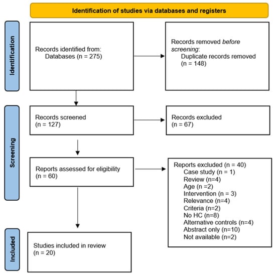 Using the selected search terms, a total of 275 papers were identified using the following databases: Embase (108), Pubmed (50), Medline (61), and Web of Science (56). Following the screening process the total number of papers was 20. A detailed outline of the search process is presented in Figure 1. All included papers investigated objective measures of sleep quality in ME/CFS patients compared to HC.