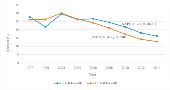 Yearly percentages of BSTU from 1997 to 2014 were calculated for Georgia and USA from the online BRFSS Prevalence Data & Data Analysis Tools [34]. Changes in percentages over time were calculated and expressed as Average Annual Percent Change (AAPC) using the Joinpoint Regression Program (Version 4.5.0.1, Statistical Methodology and Applications Branch, Surveillance Research Program, National Cancer Institute, Bethesda, MD, USA) [35]. The Annual Percentage Change (APC) indicates the utilization rate change at a constant percentage of the rate of the previous year, and is obtained by fitting a least-squares regression line to the natural logarithm of the rates using the calendar year as a regressor variable (the model is linear on the log of the response for calculating annual percentage rate change) [12,36]. The prevalence data were further analyzed by use of joinpoint models, which were aimed at evaluating longitudinal data for a change in trend. An APC was computed for each of those trends by means of generalized linear models, assuming a Poisson distribution. Changes in trend were tested for statistical significance using a Monte Carlo permutation method [12,36]. Average Annual Percentage Change (AAPC) is a summary measure of the trend over a pre-specified fixed interval. It allows us to use a single number to describe the average APCs over a period of multiple years. It is valid even if the joinpoint model indicates that there were changes in trends during those years. It is computed as a weighted average of the APCs from the joinpoint model, with the weights equal to the length of the APC interval.