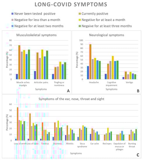 The data show that the main symptoms reported by subjects, currently suffering from COVID-19 (swab positive) were: (a) headache (90%); (b) fatigue (80%); (c) muscle aches/myalgia (70%); (d) articular pains (55%); (e) loss of smell (55%). On the other hand, subjects who were positive but had been negative for less than a month reported the following symptoms: fatigue (72%), muscle aches/myalgia (57%), and headache (53%). The symptoms reported by subjects that previously tested positive for COVID-19 but at the time of completing the questionnaire had been negative for more than a month were: fatigue (80%), articular pains (61%), muscle aches/myalgia (59%), loss of concentration (59%), and headache (54%). Similarly, subjects who previously tested positive for COVID-19 but had been negative for more than 2 months reported the following symptoms: fatigue (79%), muscle aches/myalgia (53%), and headache (49%). Finally, individuals who had tested negative for COVID-19 for at least 3 months indicated that they suffered from these symptoms: fatigue (74%), muscle aches/myalgia (61%), and articular pains (59%).