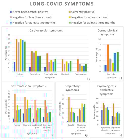 Percentages of symptoms reported by subjects in different COVID-19 conditions. The symptoms were divided into sub-categories: Musculoskeletal symptoms (A); Neurological symptoms (B); Symptoms regarding the ear, nose, throat, and sight (C); Cardiovascular symptoms (D); Dermatological symptoms (E); Gastrointestinal symptoms (F); Respiratory symptoms (G); Psychological/Psychiatric symptoms (H).