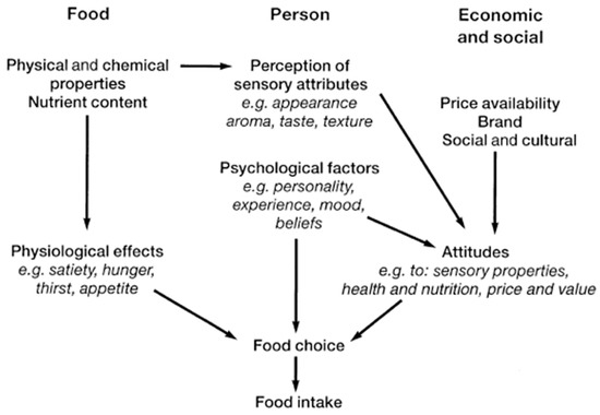 - Shepherd, R. Influences on Food Choice and Dietary Behavior. Nutr. Oppor. Asia 2005, 57, 36–43. [Google Scholar] [CrossRef]