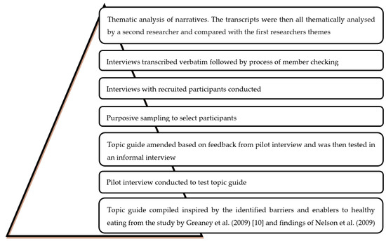 - Fade, S.A.; Swift, J.A. Qualitative research in nutrition and dietetics: Data analysis issues. J. Hum. Nutr. Diet. 2010, 24, 106–114. [Google Scholar] [CrossRef] [PubMed]